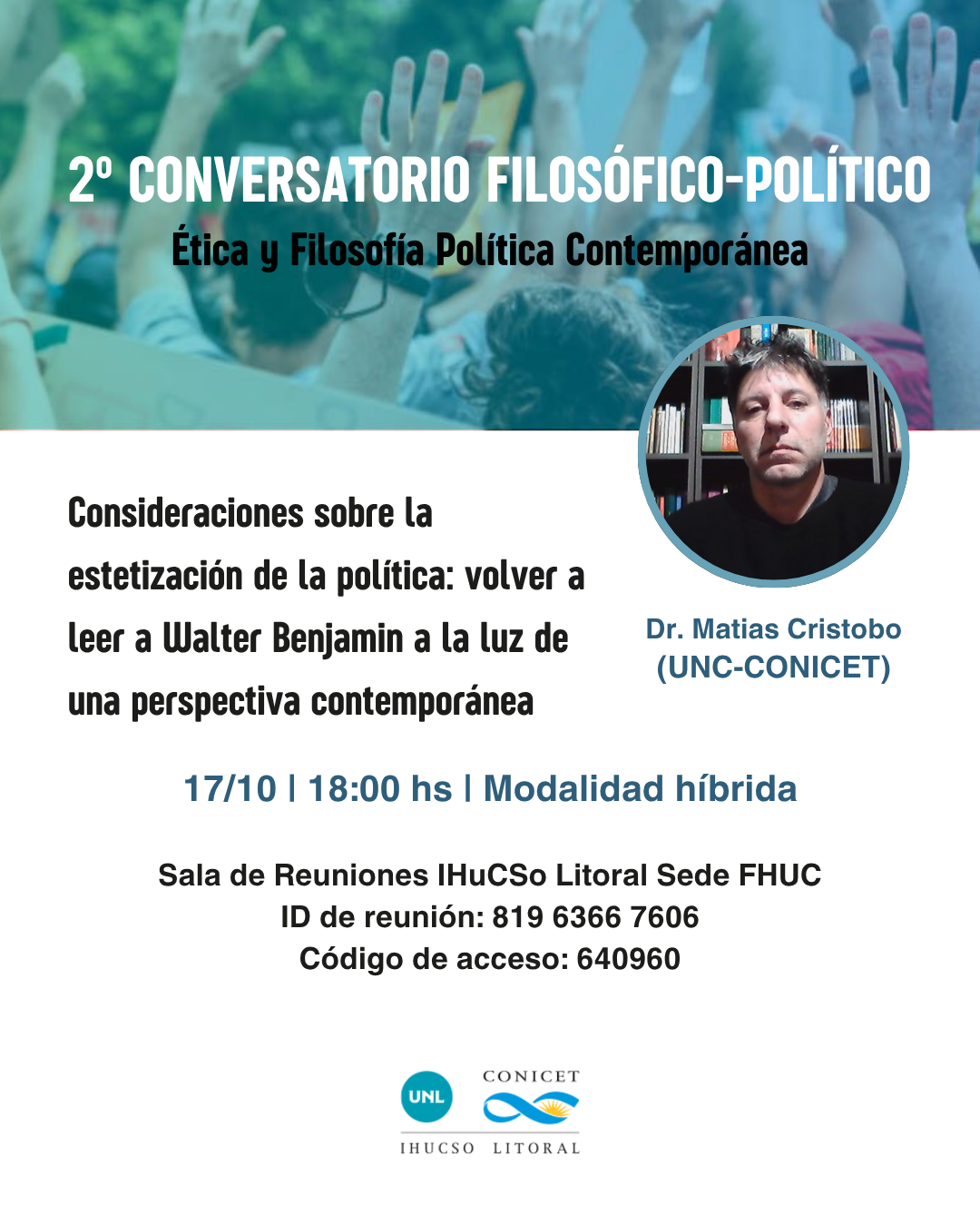 En esta oportunidad disertará el Dr. Matías Cristobo, Investigador del CONICET en el CCONFINES, con la presentación "Consideraciones sobre la estetización de la política: volver a leer a Walter Benjamin a la luz de una perspectiva contemporánea".