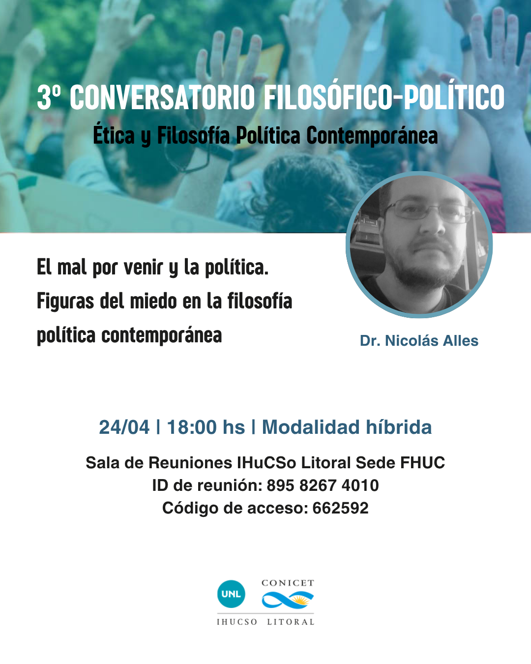 El día viernes 24 de abril a las 18:00 hs. en la Sala de Reuniones del IHuCSo Litoral sede FHUC y de forma virtual, se llevará a cabo un nuevo encuentro del ciclo denominado "Conversatorio Filosófico-político" del Grupo de estudio de Filosofía “Ética y Filosofía Política Contemporánea”.