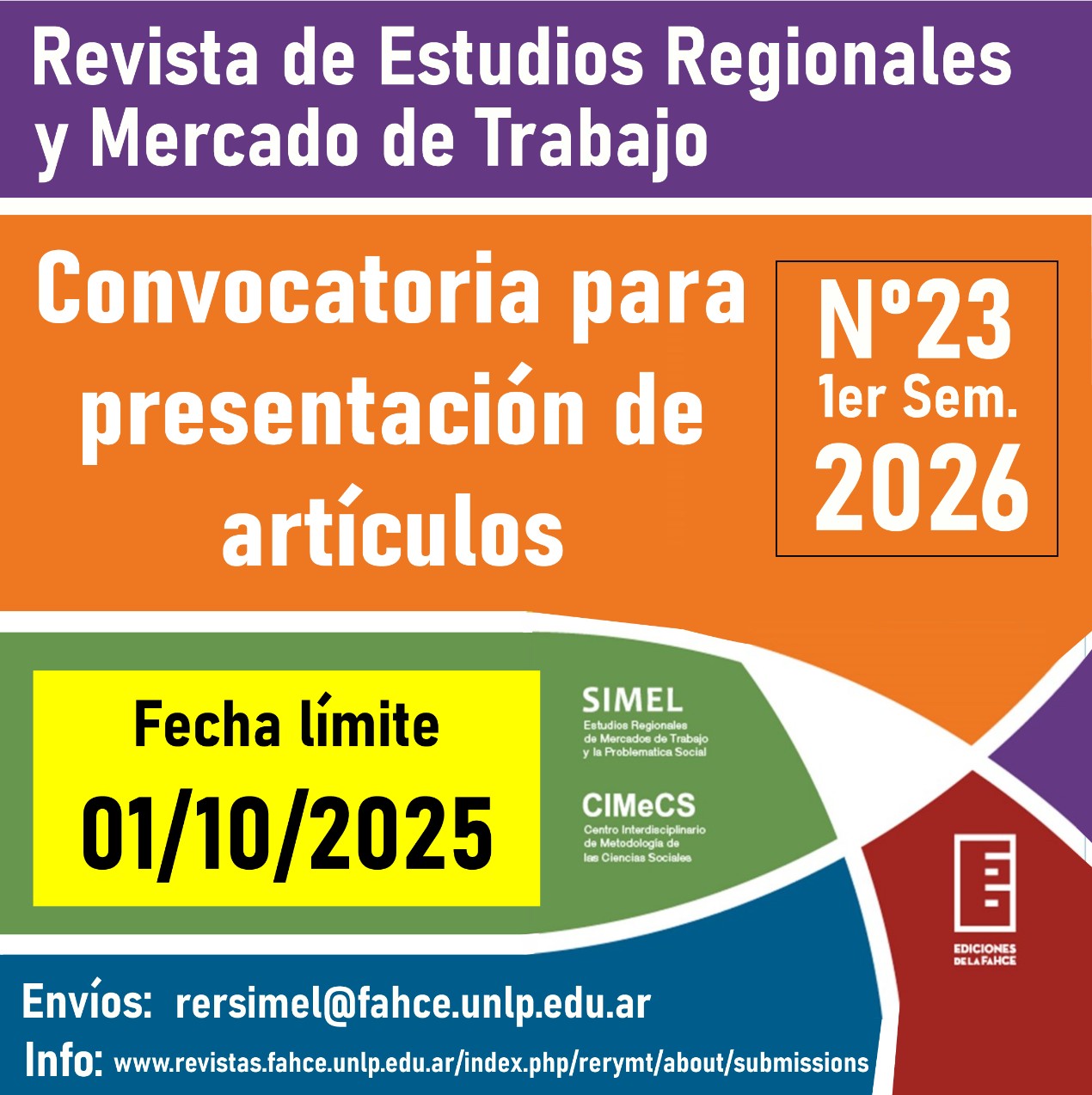 Presentación de artículos libres - 2do semestre de 2026 La Revista de Estudios Regionales y Mercado de Trabajo es una publicación científica en línea, de carácter semestral, dedicada al análisis del desarrollo urbano y regional en Argentina y América Latina, en el marco de los procesos de transformación a escala mundial. Editada conjuntamente por el SIMEL (Sistema de Información del Mercado Laboral) y el CIMeCS (Centro Interdisciplinario de Metodología de las Ciencias Sociales) – IdIHCS (UNLP-CONICET), convoca a la presentación de artículos originales e inéditos.