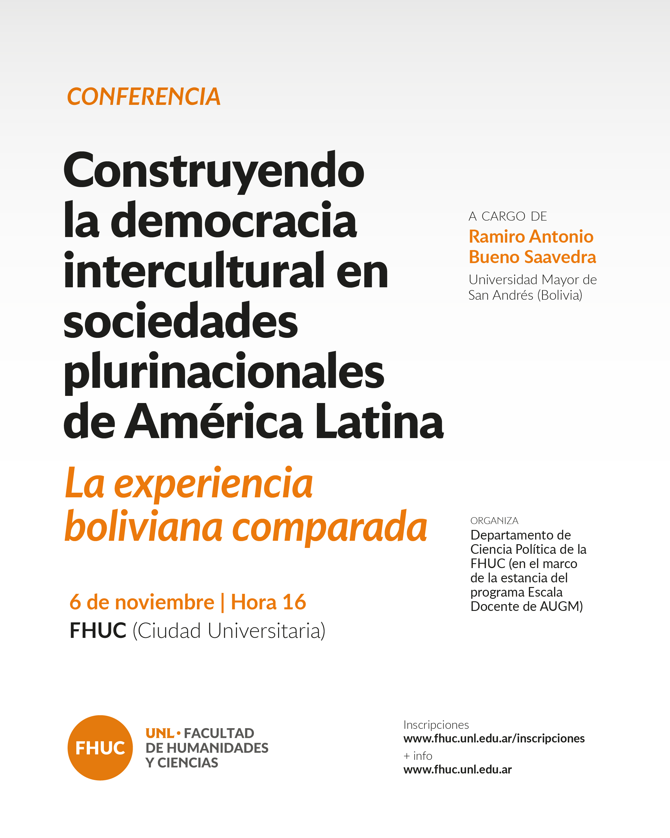 El 6 de noviembre de 2025 a la hora 16 en la Facultad de Humanidades y Ciencias de la UNL, se realizará la conferencia “Construyendo la democracia intercultural en sociedades plurinacionales de América Latina: La experiencia boliviana comparada”. La misma estará a cargo de Ramiro Antonio Bueno Saavedra (Universidad Mayor de San Andrés, Bolivia).