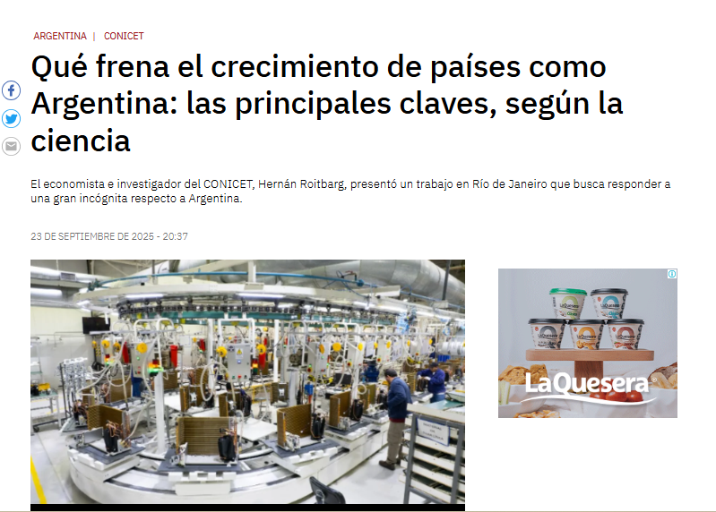 Allí, comenta que presentó un trabajo en Río de Janeiro que busca responder a una gran incógnita respecto a Argentina que busca responder una pregunta central: ¿por qué países como la Argentina, con recursos y talento, no logran alcanzar todo su potencial de crecimiento?