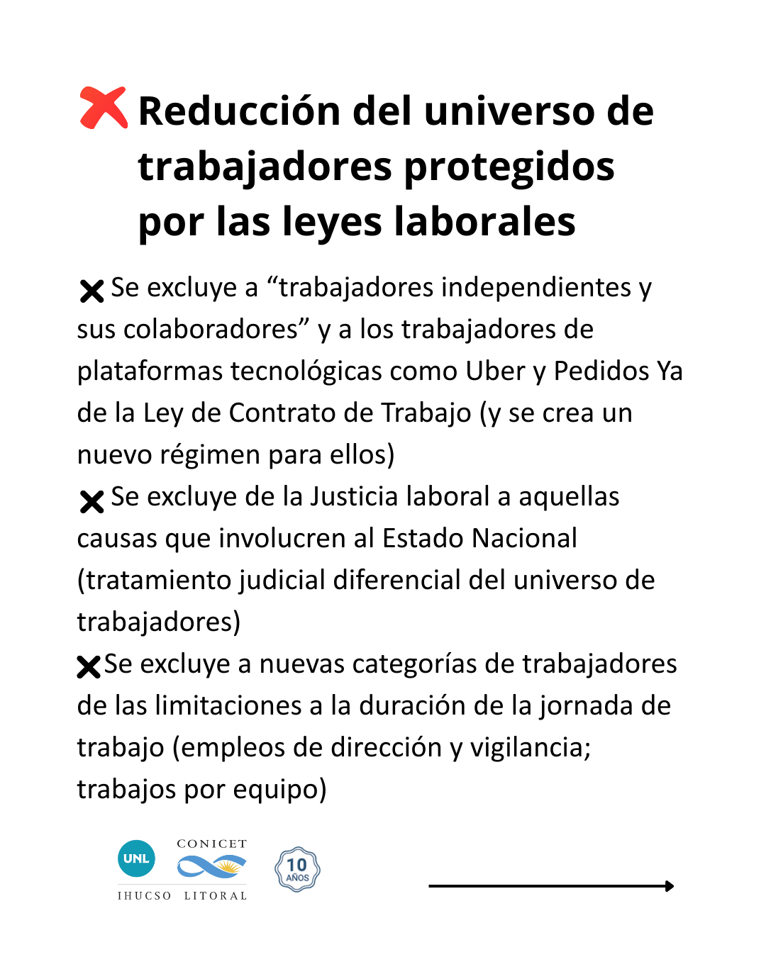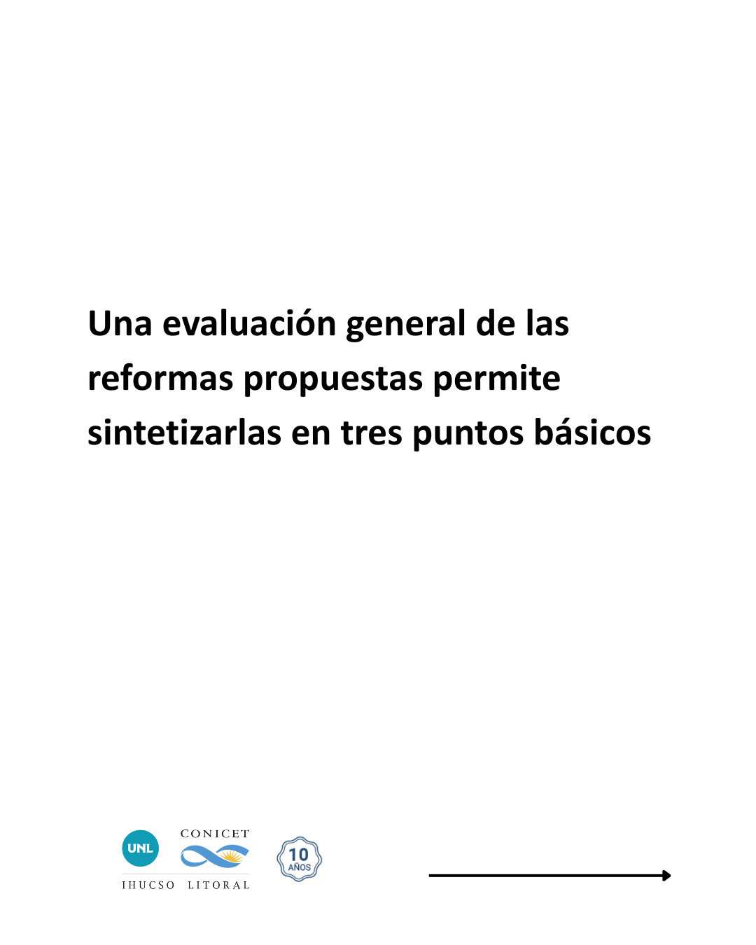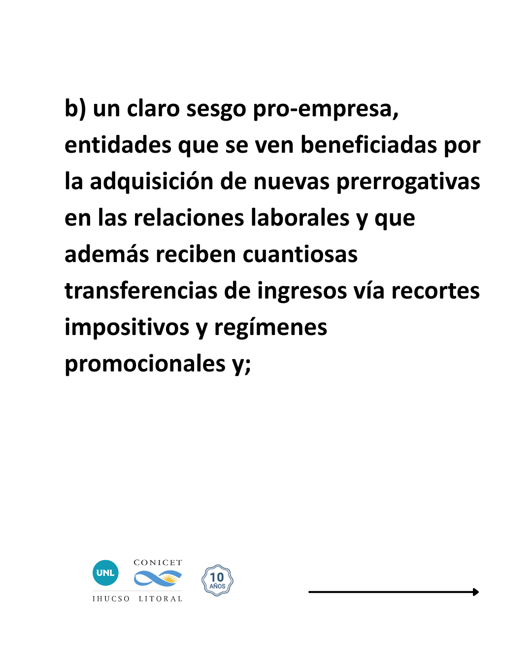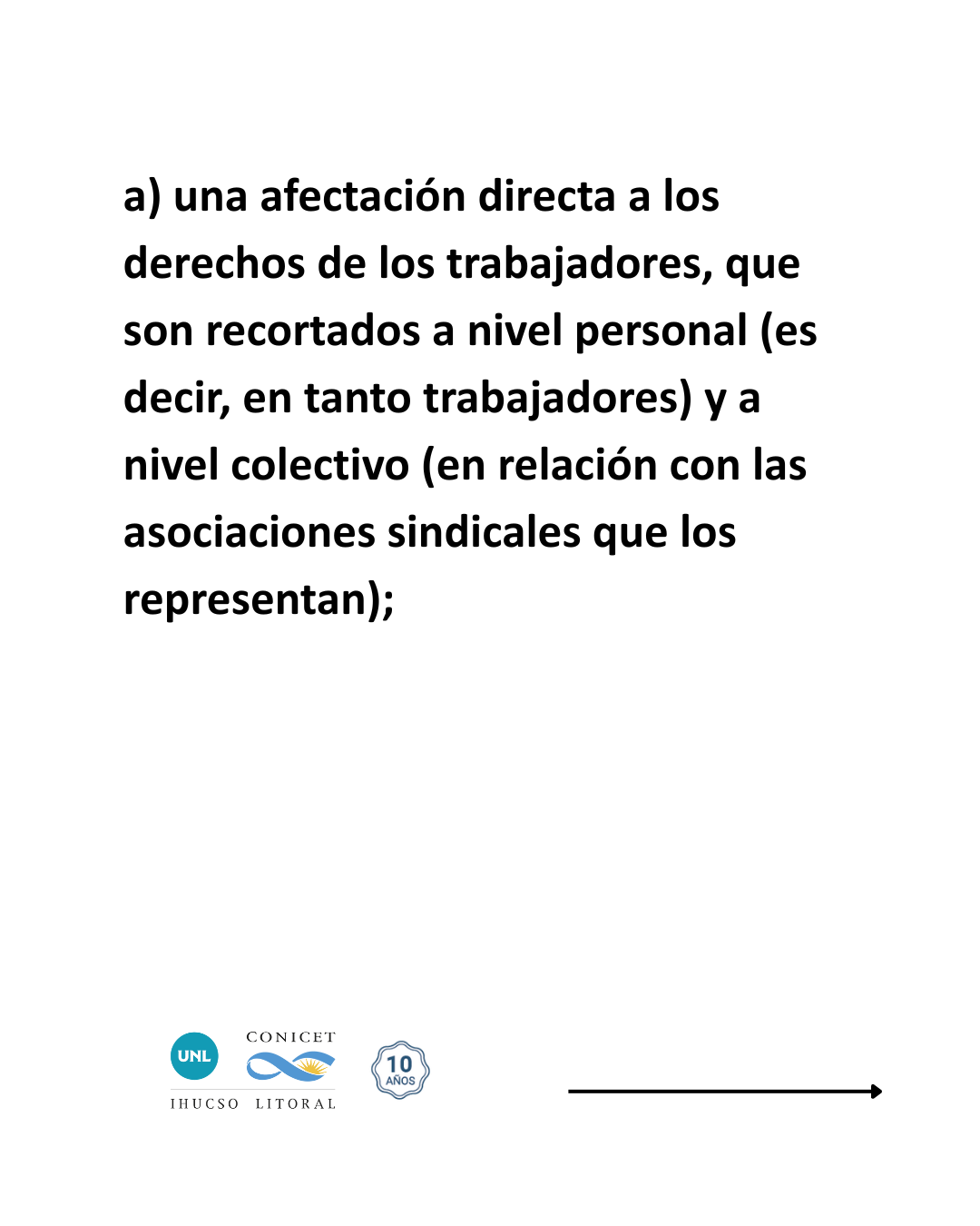 "Una evaluación general de las reformas propuestas permite sintetizarlas en tres puntos básicos: a) una afectación directa a los derechos de los trabajadores, que son recortados a nivel personal (es decir, en tanto trabajadores) y a nivel colectivo (en relación con las asociaciones sindicales que los representan); b) un claro sesgo pro-empresa, entidades que se ven beneficiadas por la adquisición de nuevas prerrogativas en las relaciones laborales y que además reciben cuantiosas transferencias de ingresos vía recortes impositivos y regímenes promocionales y; c) un corrimiento del Estado en tanto árbitro de las relaciones laborales -en especial porque resigna diversas competencias de control- pero también un reforzamiento de su rol coercitivo y sancionatorio de cara a los trabajadores y los sindicatos".