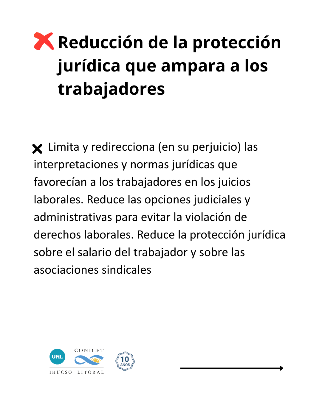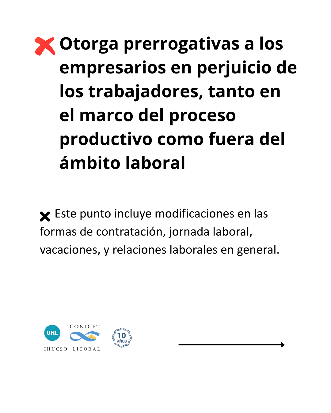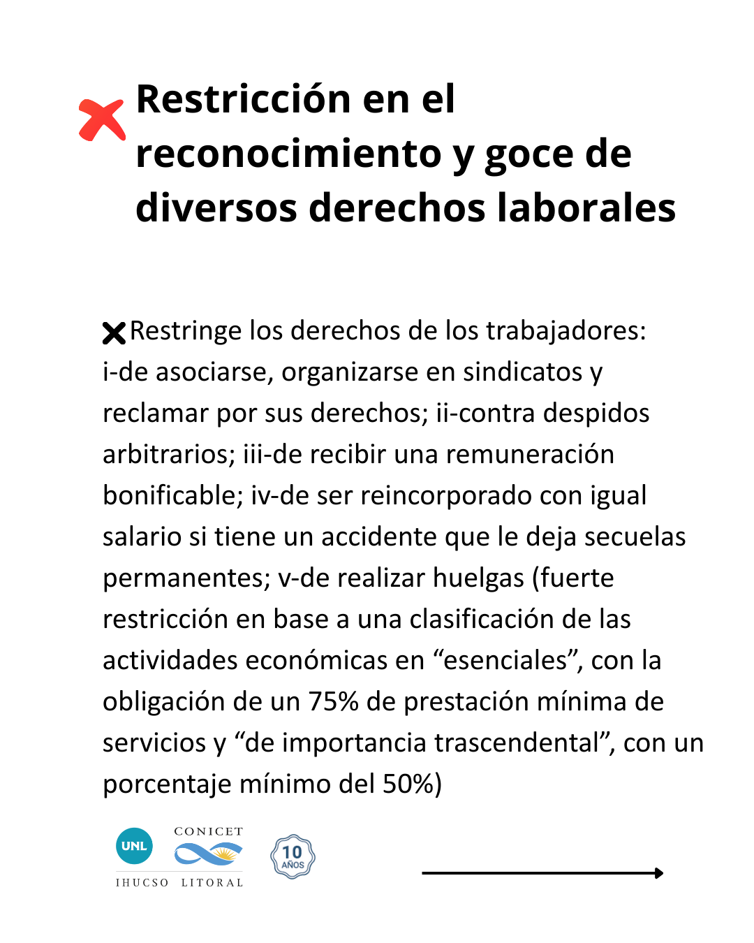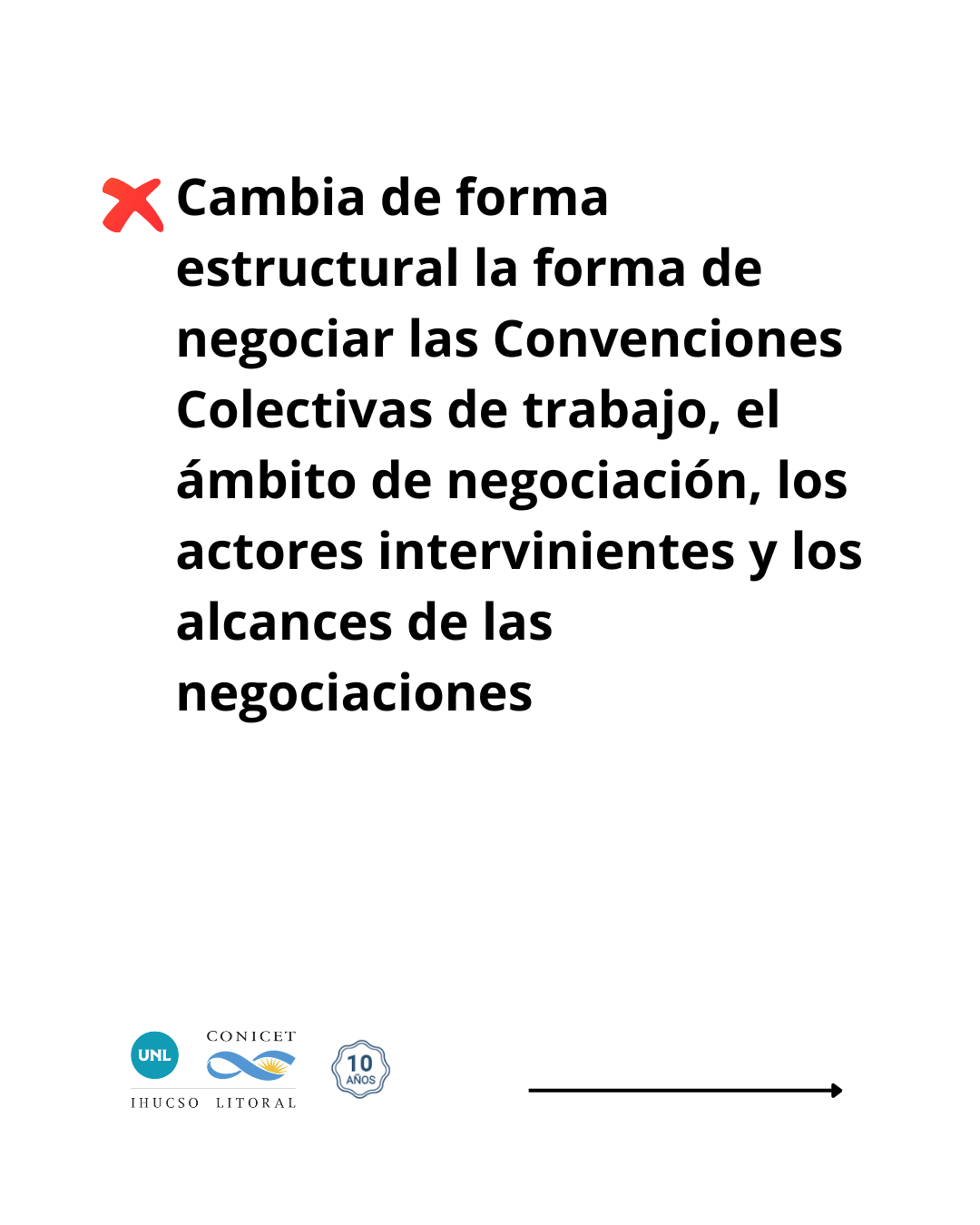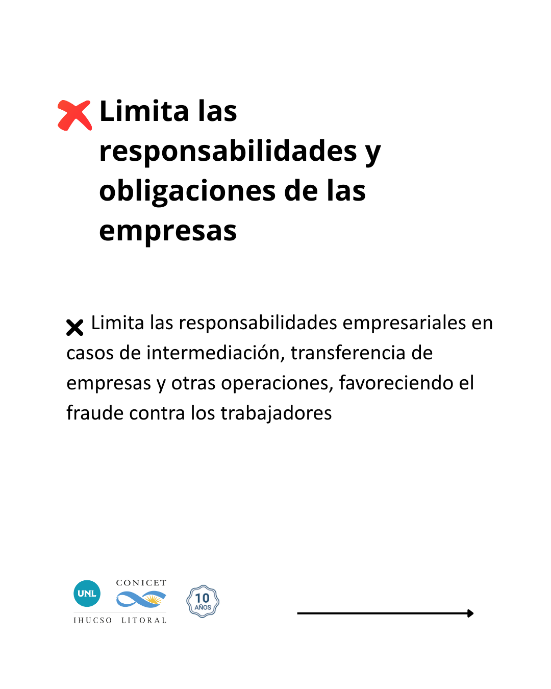 "Una evaluación general de las reformas propuestas permite sintetizarlas en tres puntos básicos: a) una afectación directa a los derechos de los trabajadores, que son recortados a nivel personal (es decir, en tanto trabajadores) y a nivel colectivo (en relación con las asociaciones sindicales que los representan); b) un claro sesgo pro-empresa, entidades que se ven beneficiadas por la adquisición de nuevas prerrogativas en las relaciones laborales y que además reciben cuantiosas transferencias de ingresos vía recortes impositivos y regímenes promocionales y; c) un corrimiento del Estado en tanto árbitro de las relaciones laborales -en especial porque resigna diversas competencias de control- pero también un reforzamiento de su rol coercitivo y sancionatorio de cara a los trabajadores y los sindicatos".