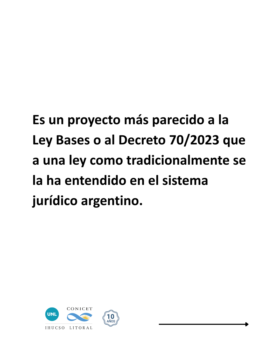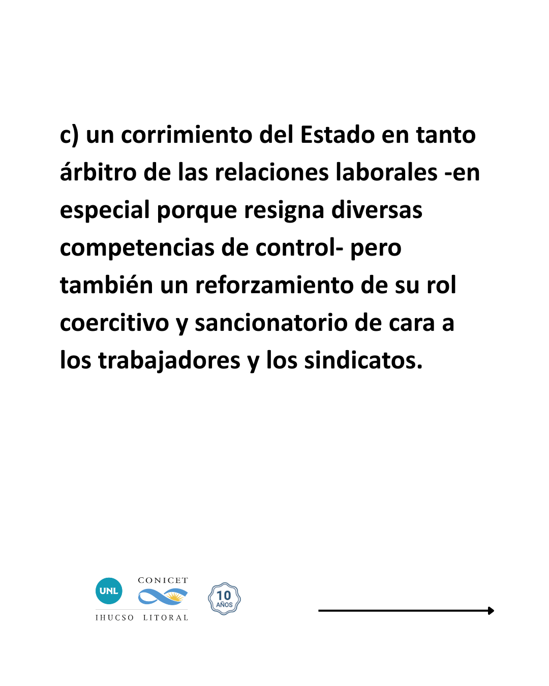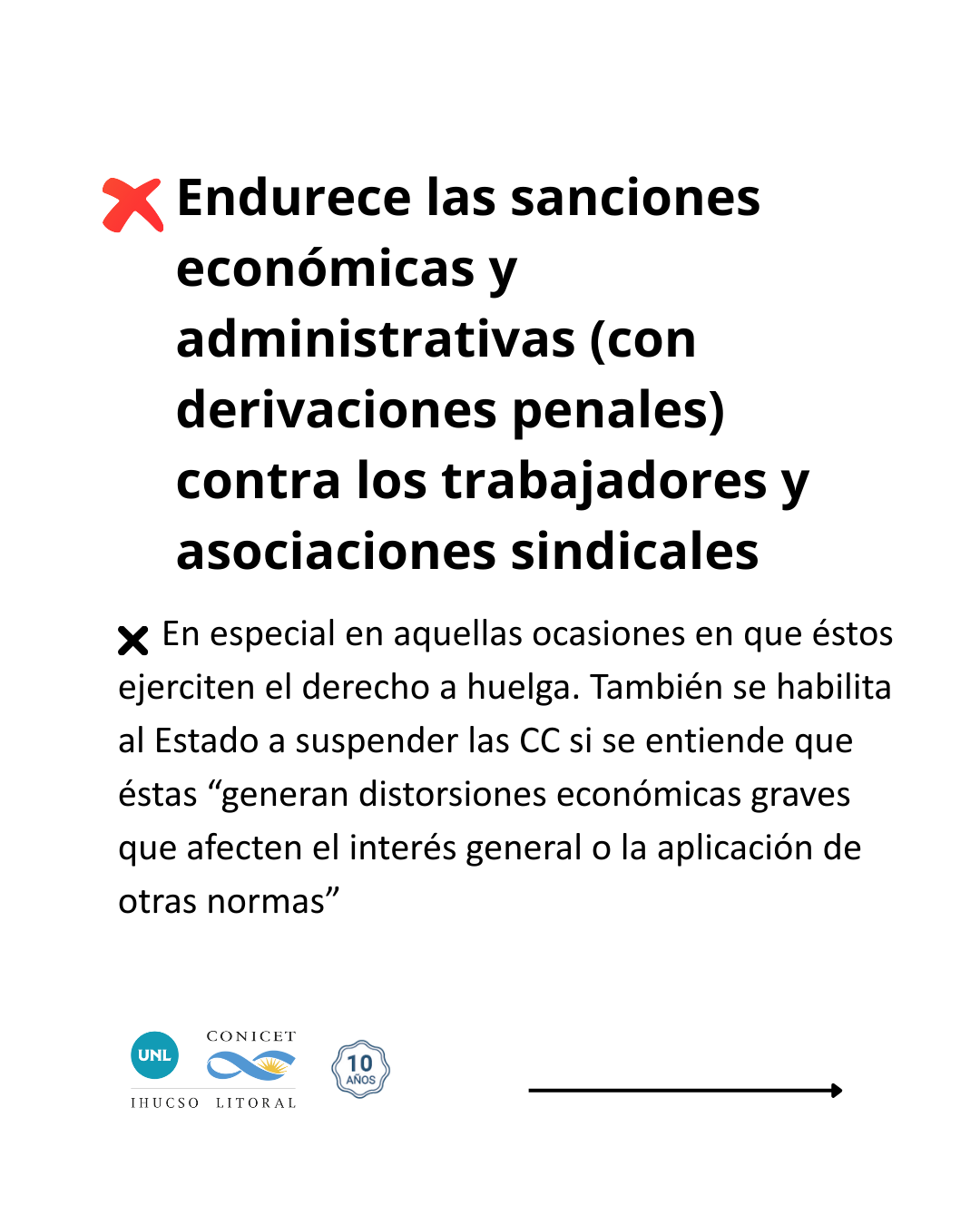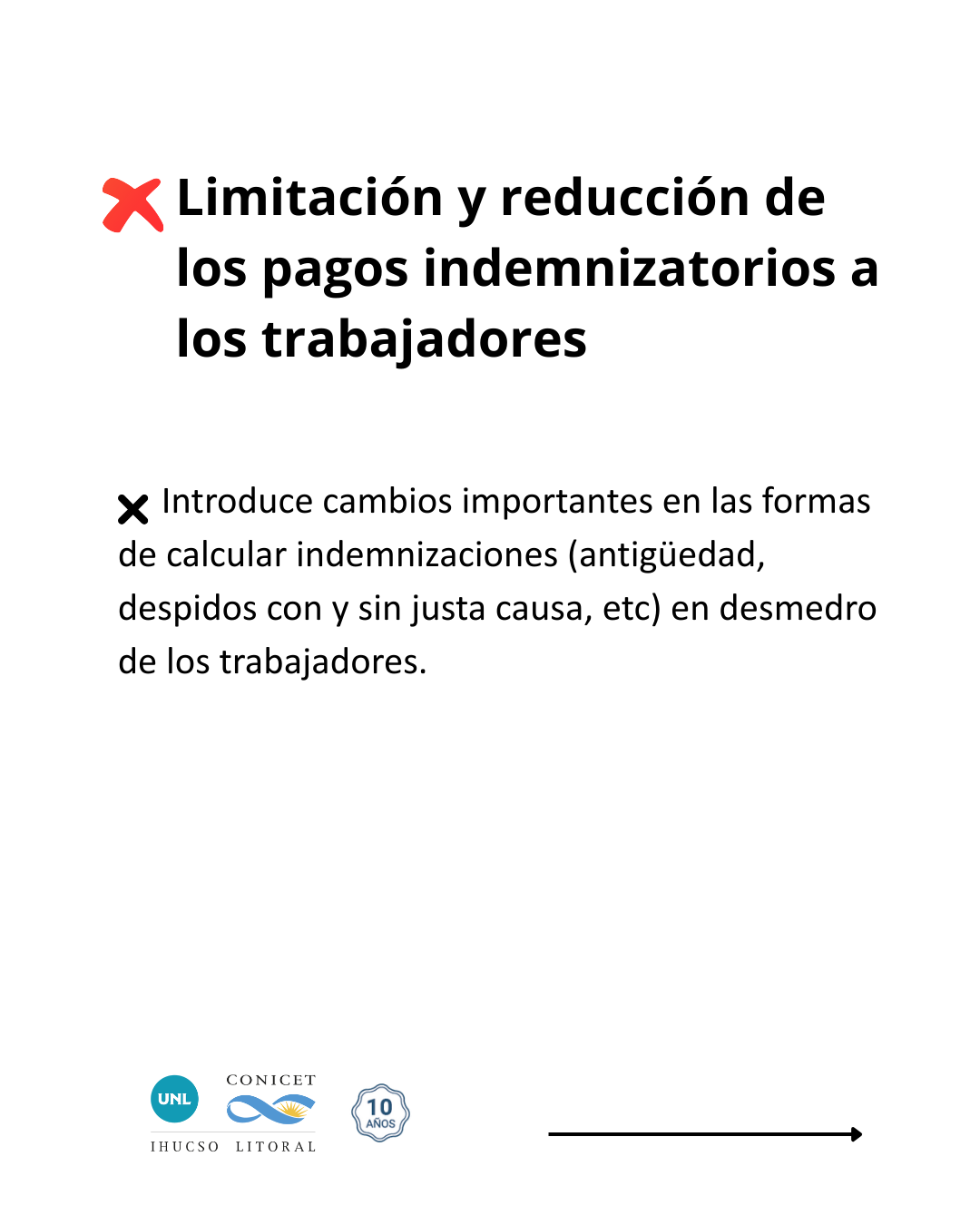 "Una evaluación general de las reformas propuestas permite sintetizarlas en tres puntos básicos: a) una afectación directa a los derechos de los trabajadores, que son recortados a nivel personal (es decir, en tanto trabajadores) y a nivel colectivo (en relación con las asociaciones sindicales que los representan); b) un claro sesgo pro-empresa, entidades que se ven beneficiadas por la adquisición de nuevas prerrogativas en las relaciones laborales y que además reciben cuantiosas transferencias de ingresos vía recortes impositivos y regímenes promocionales y; c) un corrimiento del Estado en tanto árbitro de las relaciones laborales -en especial porque resigna diversas competencias de control- pero también un reforzamiento de su rol coercitivo y sancionatorio de cara a los trabajadores y los sindicatos".