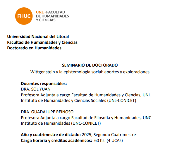 El 10 de noviembre de 2025 comenzará “Wittgenstein y la epistemología social: aportes y exploraciones”. Se trata de un seminario de posgrado, optativo del Doctorado en Humanidades (mención Filosofía), que estará a cargo de la Dra. Sol Yuan (FHUC – UNL, IHUCSO Litoral) y la Dra. Guadalupe Reinoso (UNC-CONICET).