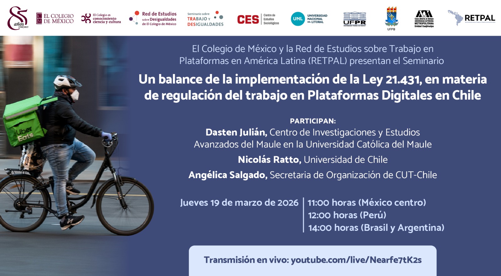El Colegio de México y la Red de Estudios sobre Trabajo en Plataformas en América Latina (RETPAL) presentan el Seminario "Un balance de la implementación de la Ley 21.431, en materia de regulación del trabajo en Plataformas Digitales en Chile".