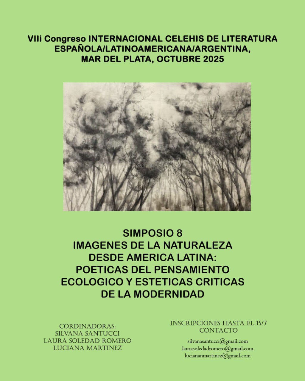 En esta oportunidad, se invita a participar del Simposio 8: Imágenes de la naturaleza desde América Latina. Poéticas de pensamiento ecológico y estéticas críticas de la modernidad, coordinado por Silvana Santucci, Laura Soledad Romero y Luciana Martínez.
