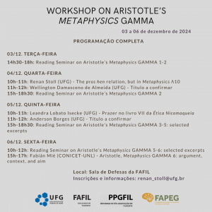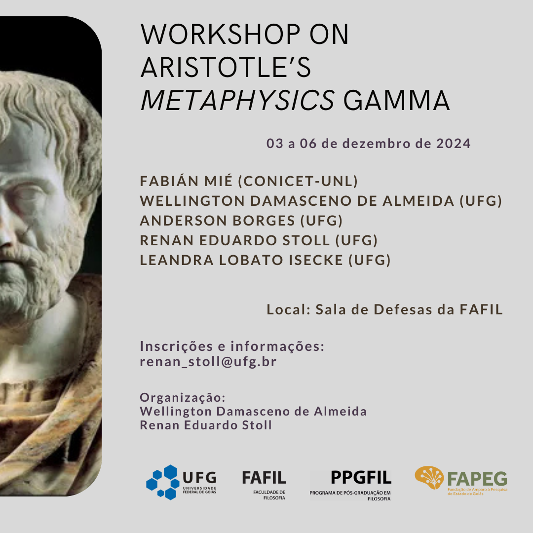 Noticias / Workshop on Aristotle's Metaphysics Gamma Workshop Workshop on Aristotle's Metaphysics Gamma - Compartir en redes socialesCompartir en FacebookCompartir en Twitter Publicado el 27 de noviembre de 2024 Tags:Workshop Del 3 al 6 de diciembre de 2024, se llevará a cabo el Workshop on Aristotle's Metaphysics Gamma. En el mismo, participará el Dr. Fabián Mié. Adjuntamos aquí el programa: CompartirCompartir en FacebookCompartir en Twitter